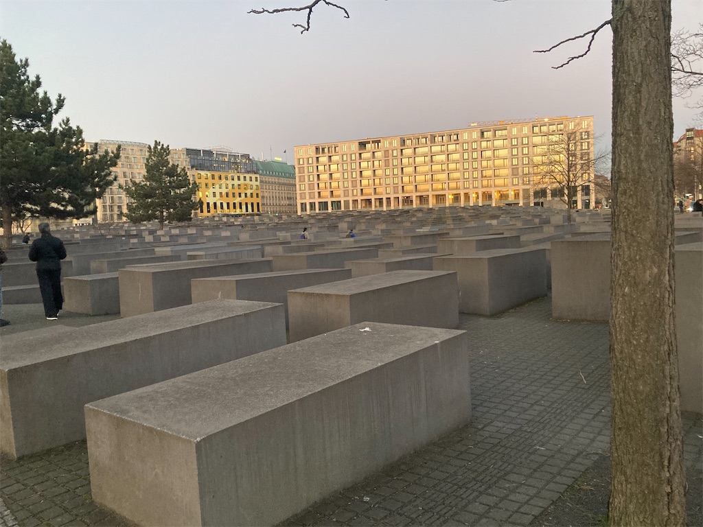 旧博物館の柱の銃弾やポツダム広場、ホロコーストの記念碑、ベルリンの壁、古い建物がすっかり破壊された近代的な街並みを見ながら、
